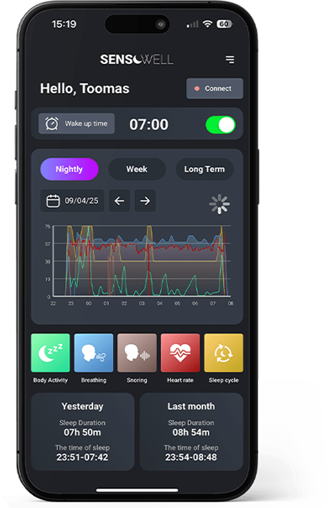 Did you know that quality sleep directly affects your well-being, energy levels, and overall health? Sensowell by Kamjo is a contactless and invisible sensor that analyzes your sleep, breathing, and heart rate – without the need for a smartwatch or fitness tracker. Simply go to sleep, and Sensowell takes care of the rest, providing more accurate data than any other device. Make small but impactful changes to wake up refreshed and energized every morning!